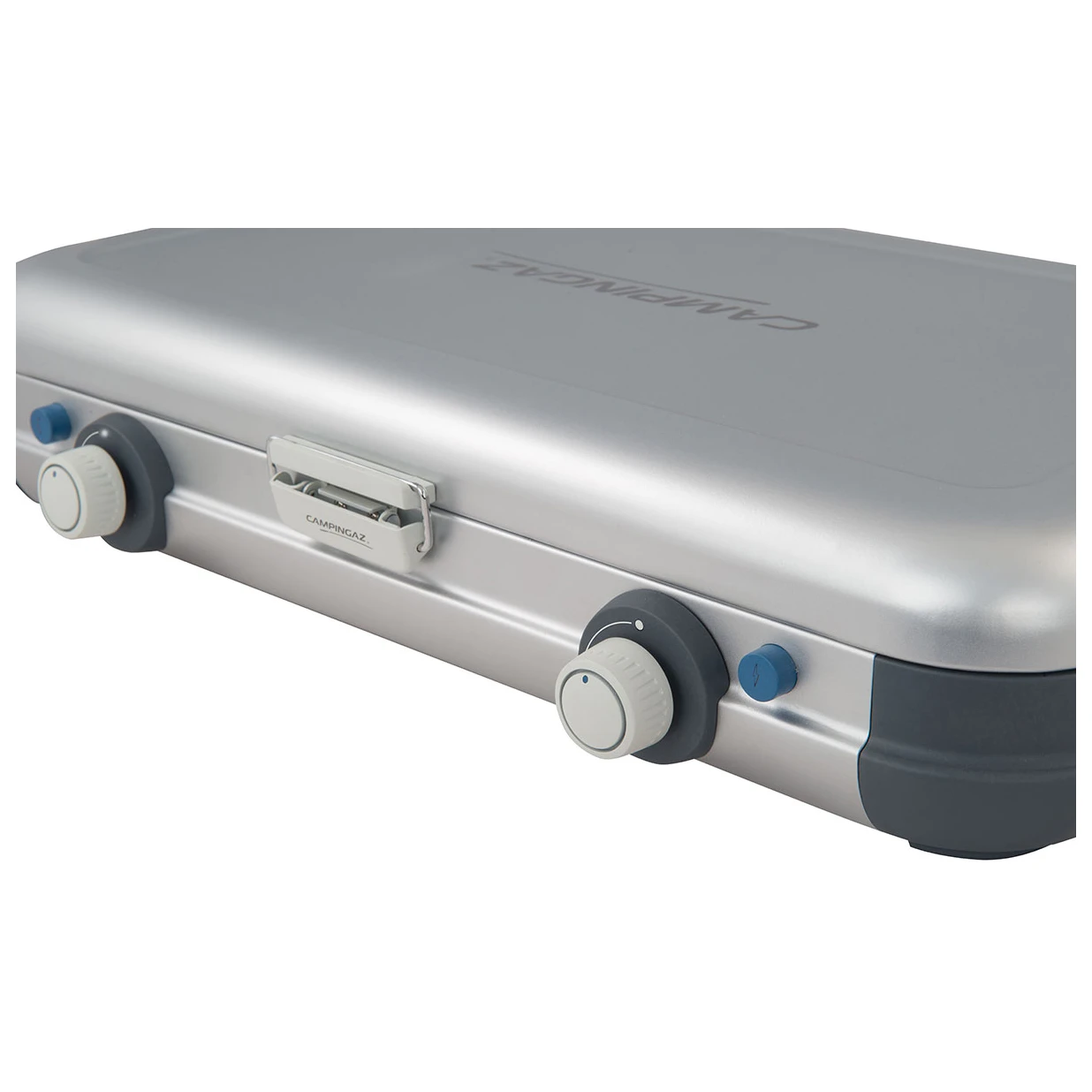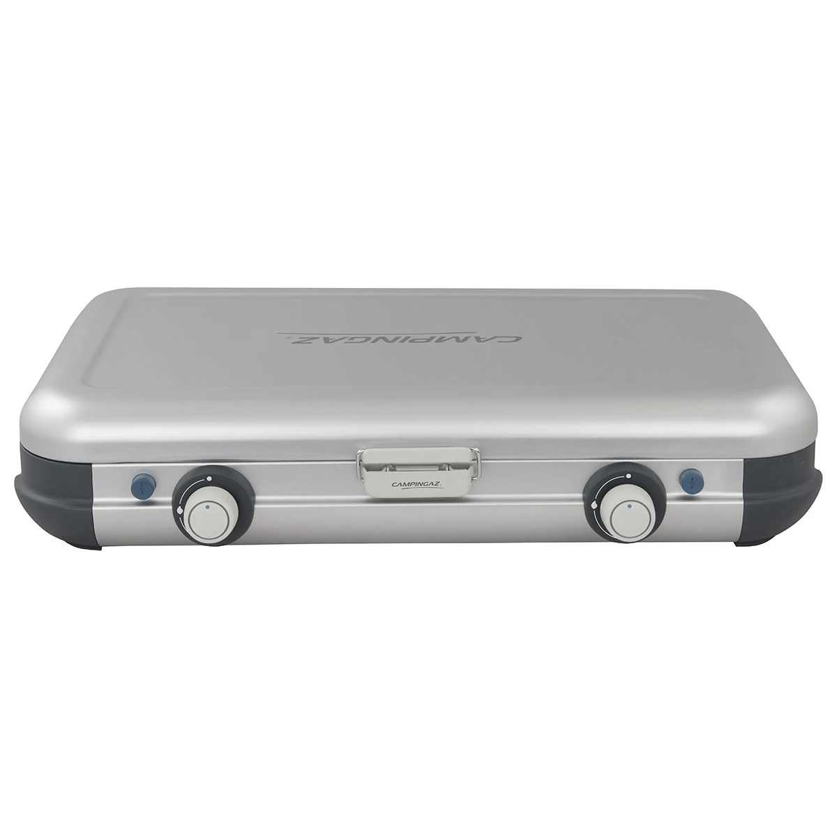 Der leicht zu transportierende Kocher kommt mit zwei Brennern. Dank der eingebauten Tragegriffe lässt er sich unkompliziert transportieren und kann platzsparend im Auto verstaut werden. Die emaillierten Topfträger aus emailliertem Stahl schützen vor Wind und lassen sich abnehmen für eine gründliche Reinigung des Brenners. Die breite Basis sorgt für einen kippsicheren Stand. Es gibt Platz für zwei Pfannen. Der Kocher wird mit einer Gaskartusche betrieben.