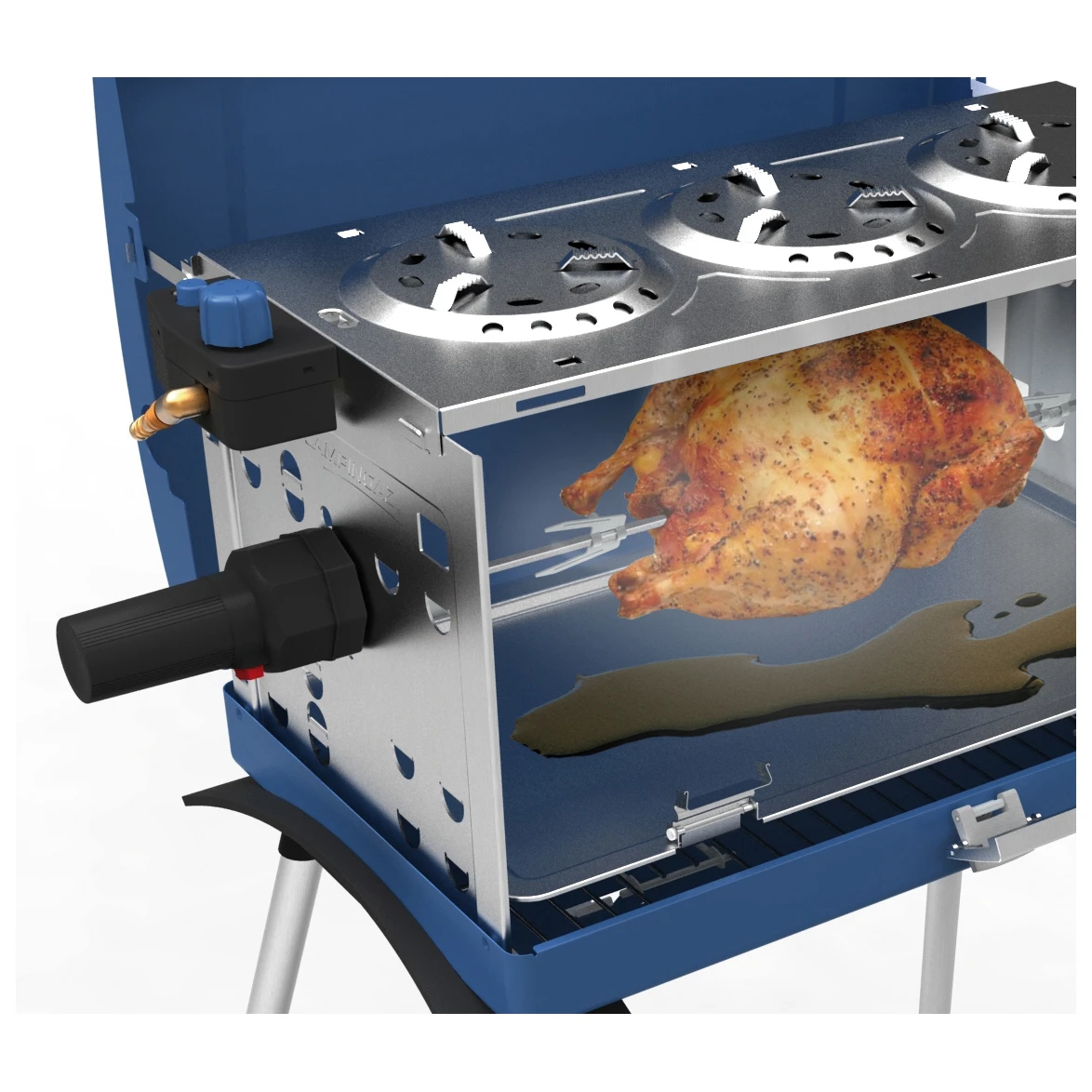 Die drei Flammen oben dienen als Herdplatten, während man darunter ein Hähnchen am Spieß oder Würstchen auf dem Grillrost grillen kann. Details wie der robuste Griff für den Transport, der mitgelieferte Drehspieß und das spülmaschinenfeste Fettauffangtablett machen den Grill komplett.