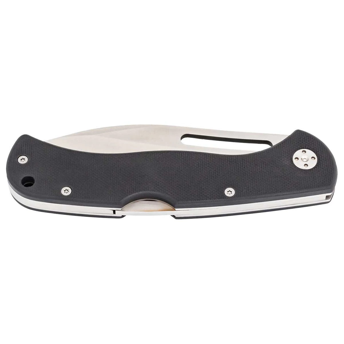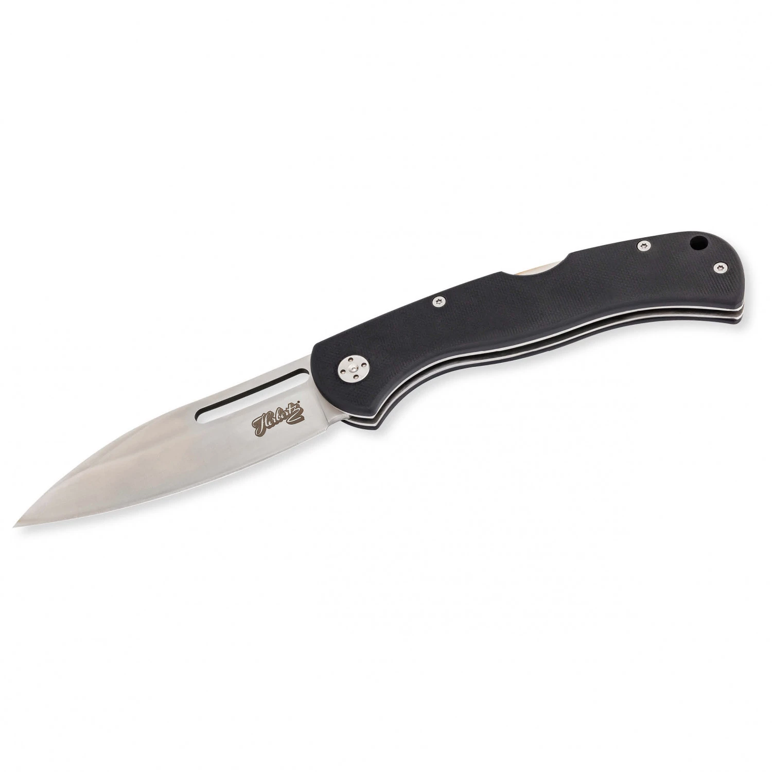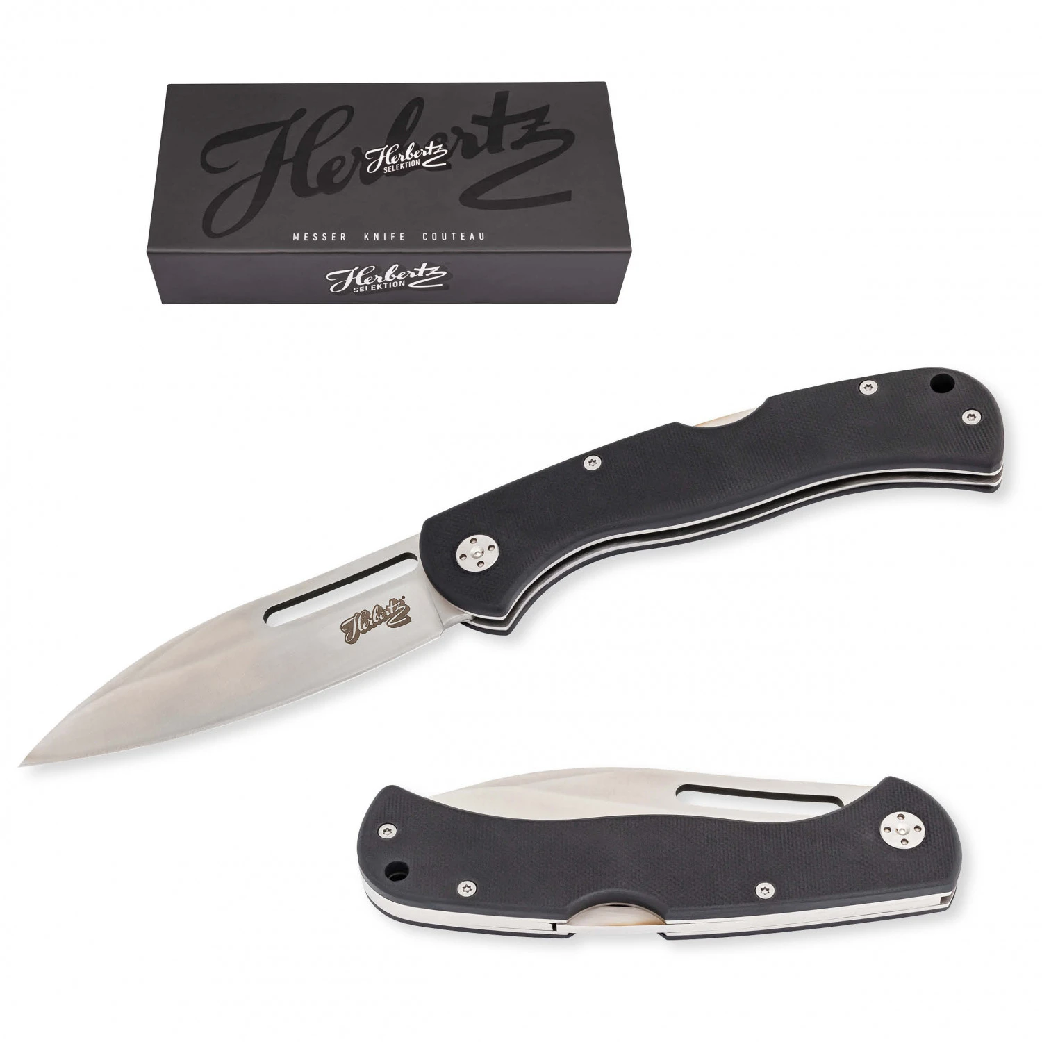 Dieses Einhandmesser aus der Herbertz Selektion Serie ist mit einer satinierten Drop Point Klinge aus rostfreiem AISI 440 Stahl ausgestattet und wird über den Klingendurchbruch in Position geschwenkt. Ein zuverlässiger Back Lock Mechanismus arretiert die Klinge in Arbeitsposition. Der ergonomische Griff ist mit Heftschalen aus strukturiertem G10 versehen. Eine praktische Fangriemenöse und eine Geschenkbox mit Magnetverschluss runden die Ausstattung ab.