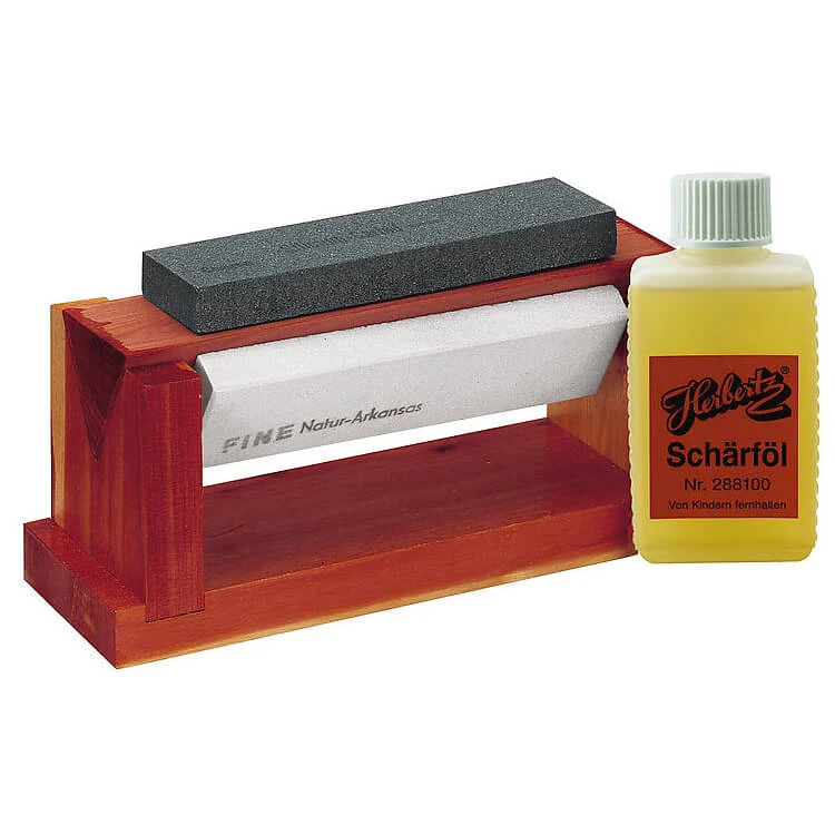 Alles für eine messerscharfe Klinge – der Holzblock mit 3 Abziehsteinen von Herbertz! Hier erhält man drei Abziehsteine mit drei verschiedenen Härten, denen der Holzblock als Halterung dient. Im Lieferumfang enthalten sind ein Silicium Carbid Stein zum groben Schleifen und Vorziehen, ein weicher Arkansas Stein zum Nachziehen sowie harter Arkansas Stein für den letzten Schliff. Dazu gibt es eine Flasche Herbertz Schärföl.