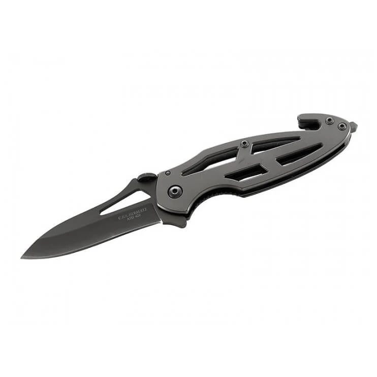 Leicht und dabei ein richtig guter Helfer in Notsituationen – das Rettungsmesser Liner-Lock von Herbertz! Das kompakte Messer kommt in einer Skelettkonstruktion, welche Material und damit Gewicht einspart, sodass das Messer schön leicht ist. Die scharfe Klinge aus AISI 420 Stahl lässt sich zur Sicherheit mit einer Liner Lock Verriegelung arretieren. Ebenfalls mit dabei sind ein Gurtschneider sowie ein Scheibenzertrümmerer – Extras, die im Ernstfall gute Dienste leisten können. Nicht zuletzt lässt sich das Messer mit einem Clip problemlos am Gurt befestigen!
