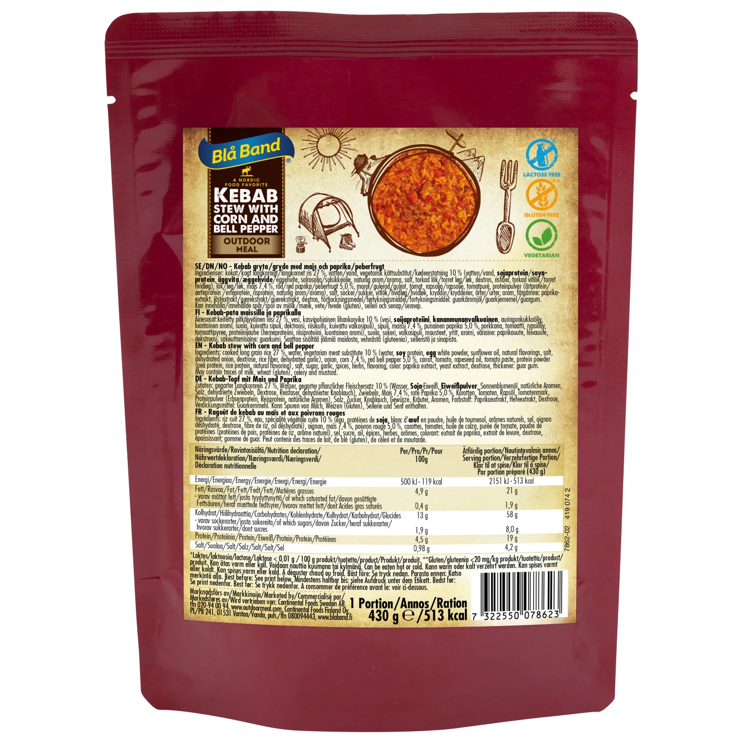 Das Outdoor-Gericht Kebab Stew with Corn and Bell Pepper von Bla Band findet in jedem Rucksack einen Platz, wenn es zum Zelten, Campen oder auf Trekkingtour geht. Mit Wasser schnell und einfach zubereitet, lässt es sich als Mittag- oder Abendessen genießen. Einfach lecker!