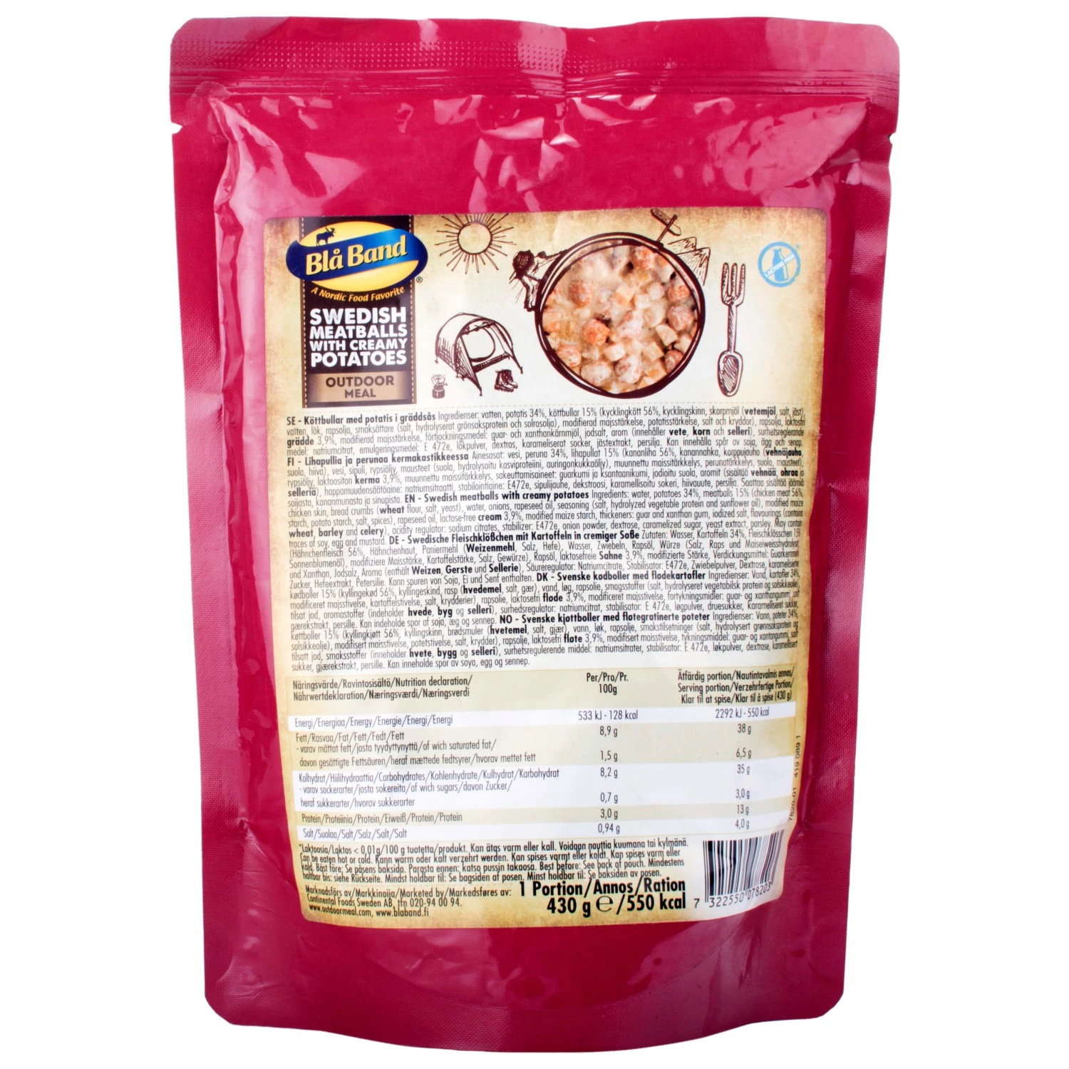 Wer ein Fan des schwedischen Nationalgericht Kjöttbullar ist, der sollte sich das Swedish Meatballs With Creamy Potatoes von Bla Band nicht entgehen lassen! Das Hauptgericht enthält Fleischbällchen aus Hähnchenfleisch, die reich an Proteinen sind. Ergänzt werden sie durch energiebringende Kartoffeln und eine cremige Sauce mit einer feinen Pfeffernote – das bringt die richtige Kraft für den nächsten Tourentag oder den Weg ans Tagesziel. Das Gericht ist laktosefrei.Zutaten: Wasser, Kartoffeln 34%, Fleischbällchen 15% (Hähnchenfleisch 56%, Hähnchenhaut, Semmelbrösel (Weizenmehl, Salz, Hefe), Wasser, Zwiebeln, Rapsöl, Gewürze (Salz, Gemüseprotein, Sonnenblumenöl), modifizierte Maisstärke, Kartoffelstärke, Salz, Gewürze), Rapsöl, laktosefreie Sahne 3,9%, modifizierte Maisstärke, Verdickungsmittel: Guarkernmehl und Xanthan, Iodsalz, Aromen (enthalten Weizen, Gerste und Sellerie, Säureregulator: Natriumcitrat, Stabilisator: E472e, Zwiebelpulver, Dextrose, karamellisierter Zucker, Hefeextrakt, Petersilie.