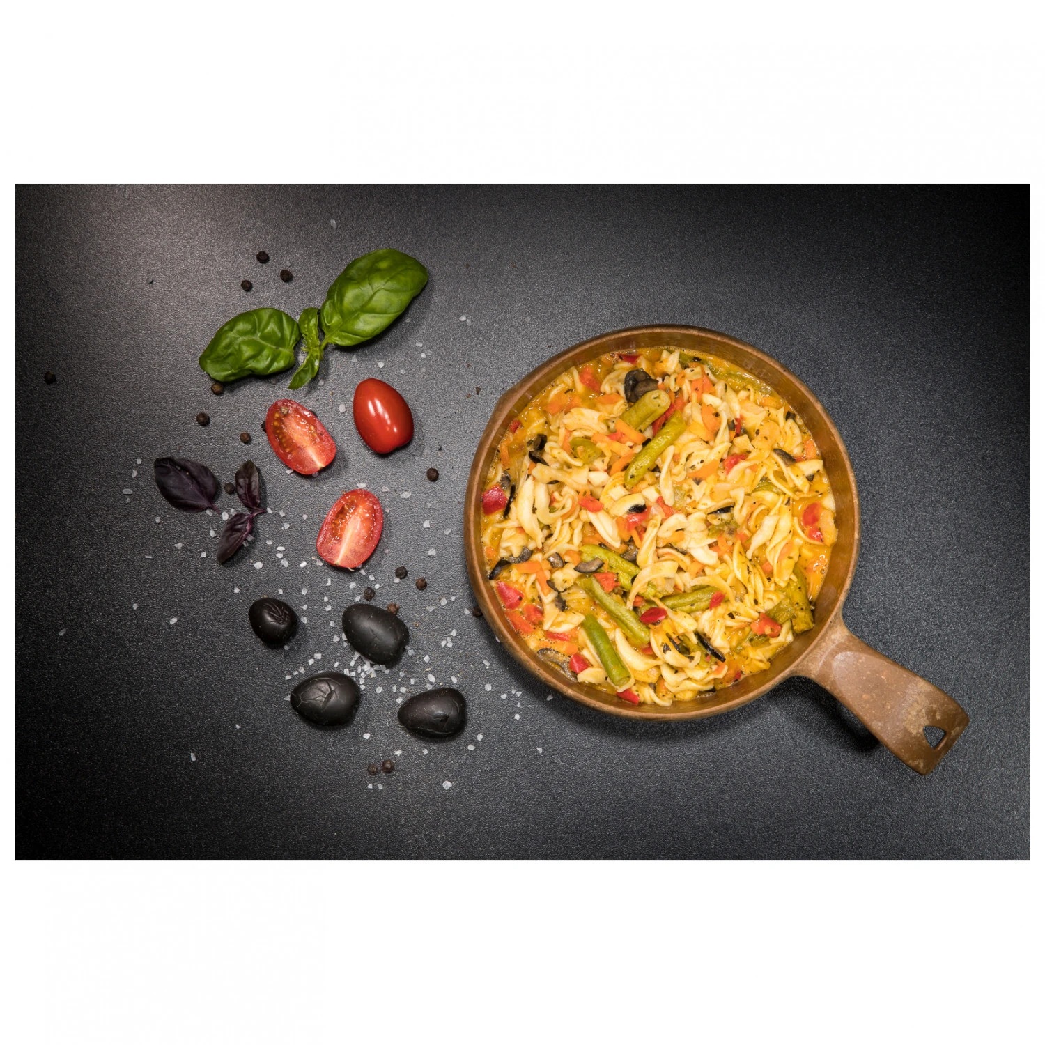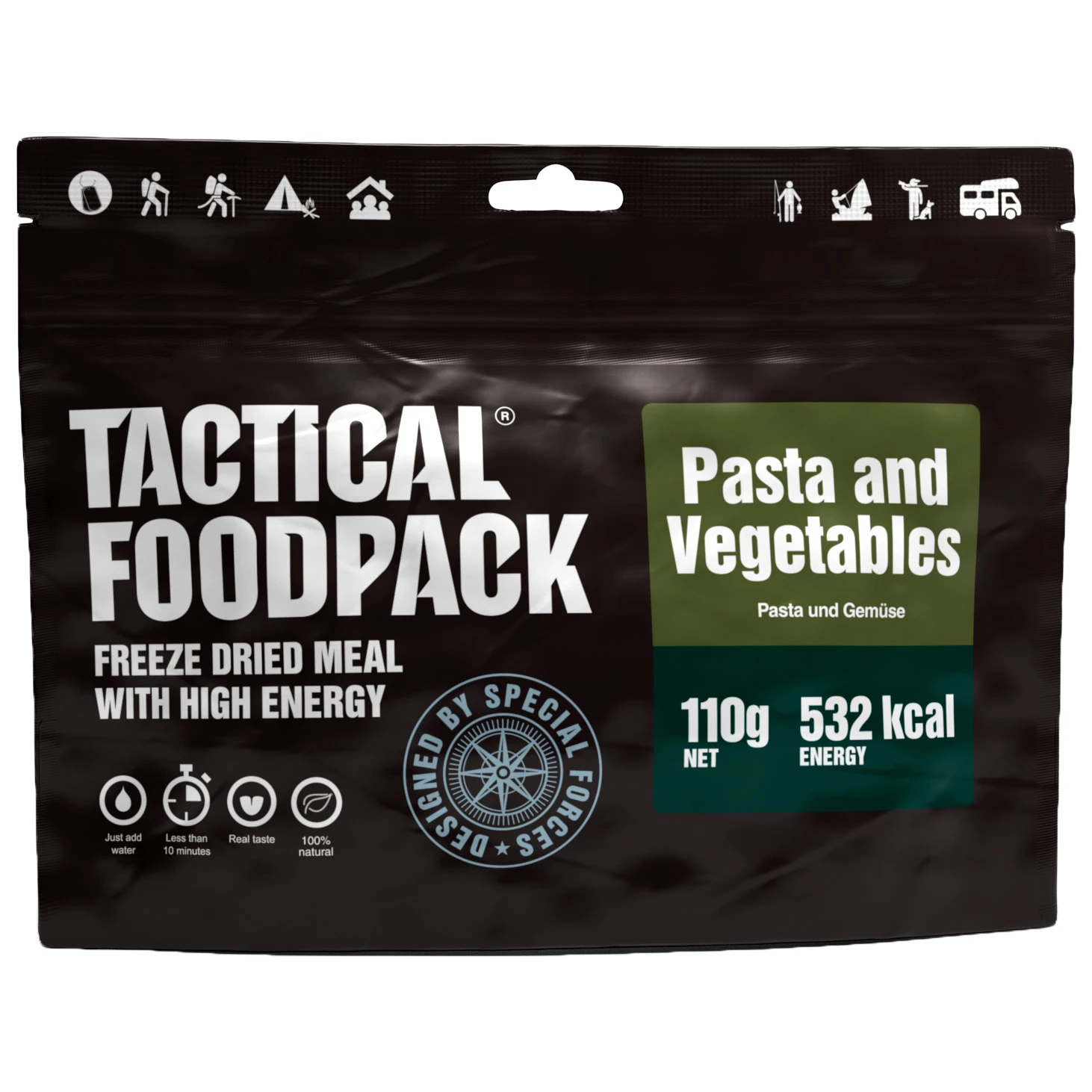 Mit dem Gericht Pasta and Vegetables von Tactical Foodpack hat man in der Wildnis oder in den Bergen ein leckeres Mittagessen dabei.