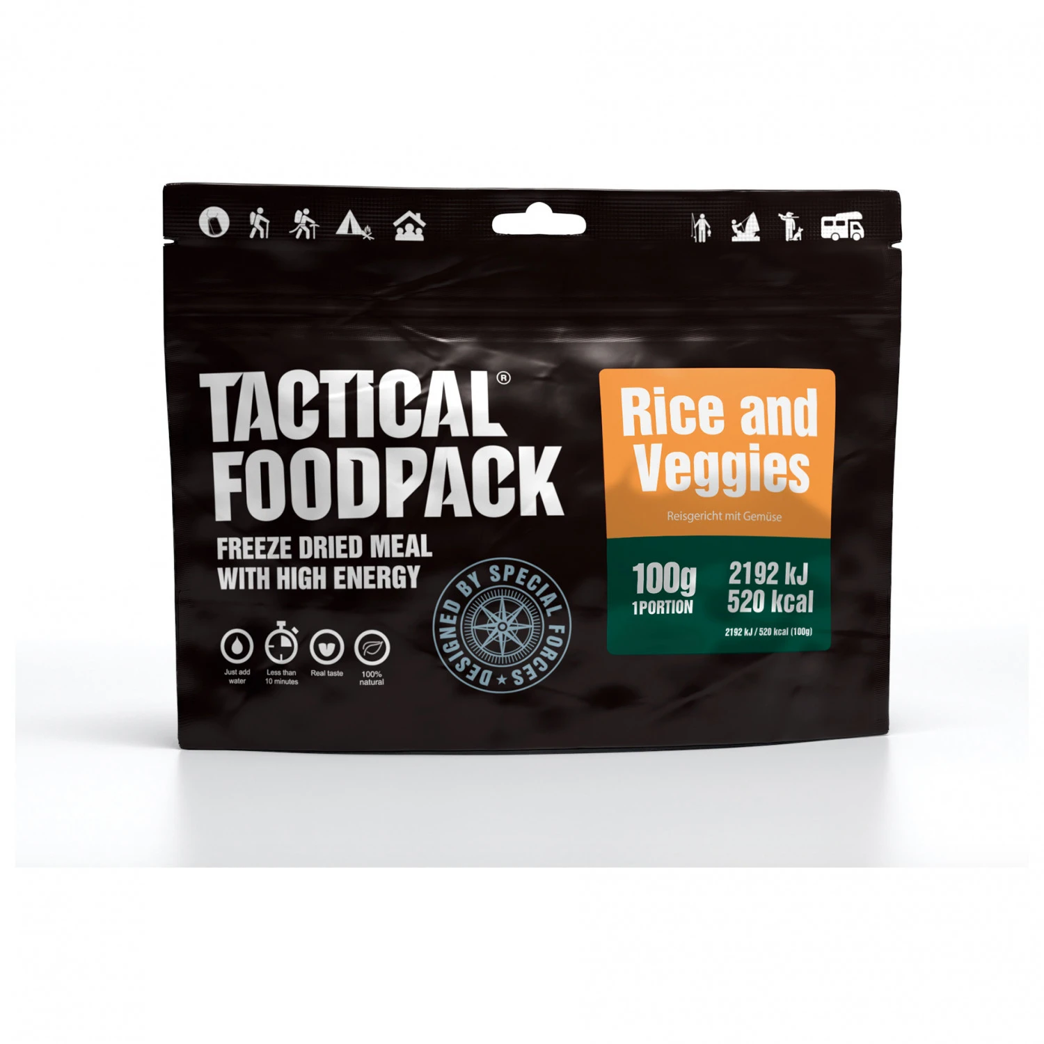 - Reis und Gemüse: Nettogewicht 100 g, Energiegehalt pro Portion 520 kcal