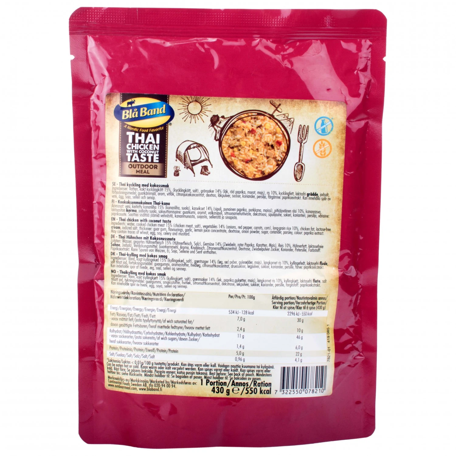 Der exotische Geschmack Thailands für draußen und unterwegs – mit dem Thai Chicken With Coconut Taste von Bla Band! Das würzige Gericht besteht aus gefriergetrockneten Zutaten, die durch dieses Verfahren nicht nur sehr leicht sind, sondern auch schnell zubereitet. Zudem gehen keine wertvollen Inhaltsstoffe verloren. Viel Hähnchenfleisch und Gemüse sorgen für die richtige Proteinzufuhr, während Reis die Kohlenhydrate liefert. Gewürze, Salz für den Elektrolythaushalt und Kräuter runden das ausgewogene Gericht schließlich ab!Zutaten: Wasser, gekochtes Hähnchenfleisch 15% (Hähnchenfleisch, Salz), Gemüse 14% (Zwiebeln, Paprika, Möhren, Mais), Langkornreis 10%, Hähnchenfett, laktosefreie Sahne, Iodsalz, Verdickungsmittel: Guarkernmehl, Aromen, Knoblauch, Zitronensaftkonzentrat, Dextrose, Zwiebelpulver, Zucker, Koriander, Petersilie, Farbstoff: Paprikaextrakt.