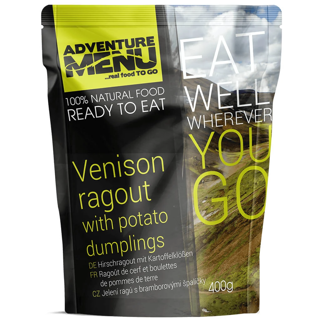 Venison ragout with dumplings ist ein vakuumverpackte Expeditionsnahrung nit Rehragout und Kartoffelklößen. Dieses Fertiggericht eignet sich für Bergtouren, Kletterurlaube, Big-Wall-Klettern, Mehrtages-Wanderungen bis hin zu großen Expeditionen. Das Gericht kann direkt in einem Kocher oder indirekt in heißem Wasser oder mit dem flammenlosen Feststoffkocher von Adventure Menu erhitzt werden. So ist die Nahrungszubereitung auf das Wesentliche begrenzt und der Expeditionist bleibt bei Kräften ohne Zeit zu verlieren.Zutaten: Rehfleisch(30%), Kartoffelklöße(Kartoffeln, Weizenmehl, Weizengrieß, Eier, Salz), Wurzelgemüse(Karotten, Sellerie, Petersilie), Rotwein, Rapsöl, Speck, Tomatenmasse(Tomaten, Salz, Zucker), Weizenmehl, Zitrone, Johannisbeermarmelade(Johannisbeere, Zucker, Pectinzucker), Zucker, Salz, Wildkräuter